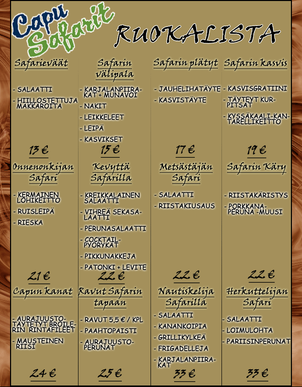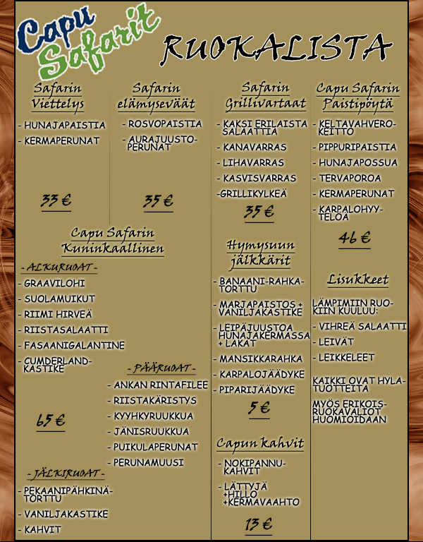 Safarin tiimellyksessä on myös mukava saada jotain purtavaa. Tutustu Capu Safarien upeaan ruokalistaan, josta löytyy varmasti jotain jokaiselle.